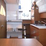 Unter Deck bietet die Cap Camarat 10.5 WA im Eingangsbereich eine Pantry mit viel Stauraum, zwei Gaskochfeldern und Spüle. Die Nasszelle mit Fenster fasst neben Toilette und Waschbecken eine separate Duschkabine. Vorne im Bug lässt sich die große Sitzecke mit Tisch in eine Doppelkoje verwandeln. Eine weitere breite Doppelkoje befindet sich mittschiffs.