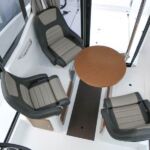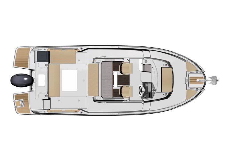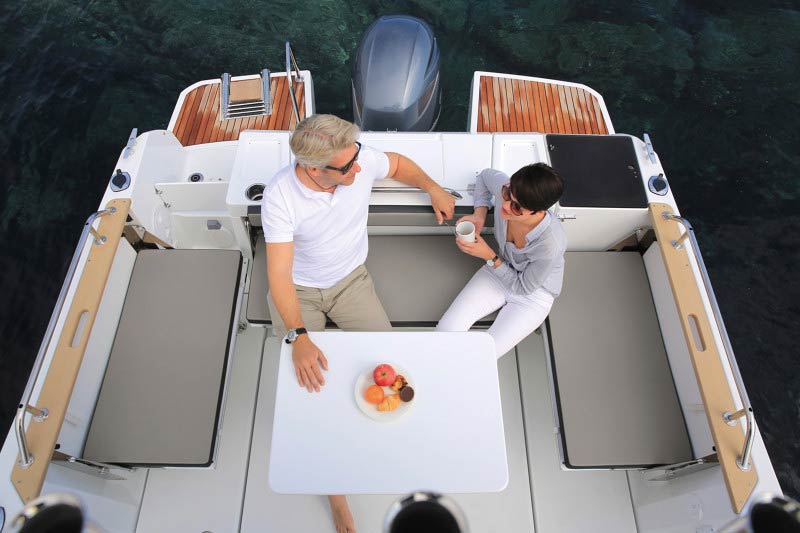 Neu im Achtercockpit ist der Angeltisch mit Schneidebrett, Becherhaltern und einem Fischbecken. Er lässt sich vorziehen, um von einer Badeplattform auf die andere zu gelangen. Vor dem Tisch befindet sich eine ausklappbare Sitzbank. Als Option können Sie weitere Klappbänke für beide Seiten erhalten. Auch lässt sich der Bereich in ein Sonnendeck verwandeln. Im Cockpitboden verbergen sich drei große Staufächer. Das Fach steuerbords können Sie mit einer optionalen Verkleidung als weiteres Fischbecken nutzen.