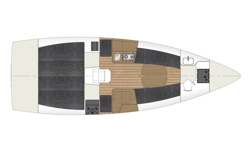 Innovativ zeigt sich die Sun Fast 3300 in erster Linie hinsichtlich ihrer Rumpfform. Der Rumpf wölbt sich unterhalb der Wasserlinie im Bug- und Heckbereich leicht konkav ein. Dadurch reduzieren sich Wasserwiderstand und Oberflächenreibung. Gleichzeitig verstärkt sich der Auftrieb. Das flache Unterwasserschiff sorgt für ein frühes Angleiten. Ungewöhnlich ist der an den Seitenflächen gewölbte Rumpf. So ist der Rumpf mittig circa zwanzig Zentimeter breiter als oben an Deck. Das spart Gewicht ein, erhöht die Festigkeit und verlagert den Gewichtsschwerpunkt nach unten. An ihrer breitesten Stelle misst die Jeanneau 3,40 Meter. Dass sich diese unterhalb des Decks befindet, müssen Sie beim An- und Ablegen berücksichtigen. Der erhöhte Auftrieb verhindert bei Krängung ein zu starkes Eintauchen des Bugs. Optional erhalten Sie zusätzliche Ballasttanks, die das aufrichtende Moment verstärken.