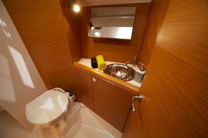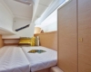Im großzügigen Salon laden an einem ausklappbaren Salontisch zwei gegenüber liegende Sofas zum Verweilen ein. Diese lassen sich auch als zusätzliche Schlafplätze nutzen. Darunter befinden sich Staufächer. An Backbord gegenüber der Pantry bietet ein hochklappbarer Kartentisch einen praktischen Arbeitsplatz. Für längere Törns empfiehlt sich das Standardlayout mit zwei Kabinen: So verfügen Sie über eine größere Heckkabine, eine extra große Nasszelle mit separater Dusche und mehr Stauraum. Für ein bis zwei Nächte mit einer großen Crew ist die Version mit drei Kabinen optimal. Dann teilt sich das Heck in zwei gleich große Kabinen mit 1,40 Meter breiten Doppelkojen auf.