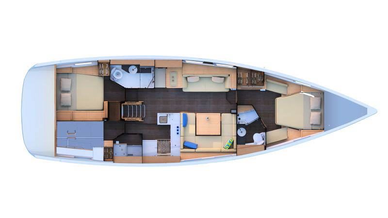 Unter Deck erwartet Sie ein attraktives Interieur, das der Designer Andrew Winch gestaltete. Wählen Sie zwischen Furnieren aus Teak oder hellem Eichenholz. Standarmäßig verfügt die Jeanneau 51 über drei Kabinen und drei Nasszellen. Der Salon bietet einen großen Sitzbereich mit ausklappbarem Tisch und eine voll ausgestattete Pantry mit Kühlschrank, Herd, Spüle und Ofen. Von allen Seiten dringt Licht durch langgestreckte Fenster und große Luken ein. Auch in der Masterkabine profitieren Sie von seitlichen Fenstern und einem Oberlicht. Ein extrabreites Bett und hohe Decken bieten allen Komfort für erholsame Nächte an Bord. Optional lässt sich die Achterkabine steuerbords auch als Skipperkabine oder als Werkraum gestalten. Eine der drei Nasszellen können Sie alternativ als Waschraum mit Waschmaschine und Trockner ausstatten.