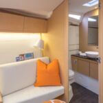 Im Interieur erwartet Sie der pure Luxus: Klimaanlage, zwei Kühlschränke, Weinkühler, Spülmaschine und Waschmaschine gehören zur (optionalen) Ausstattung. Ein Herd mit drei Kochfeldern und ein Ofen ermöglichen unterwegs eine Verpflegung auf hohem Niveau. Die Innenraum-Konfigurationen sind zahlreich: So können Sie sich für einen großen Salon, der sich über die gesamte Schiffsbreite erstreckt, entscheiden. Die Pantry findet dann in einem separaten Raum anstelle einer zweiten Heckkabine Platz. Ansonsten liegt die Pantry klassisch der Salonsitzecke gegenüber.