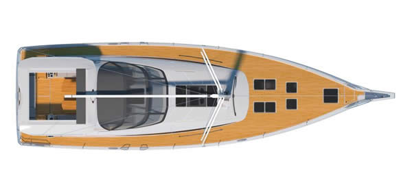 Im hinteren Bug bleibt Platz für zwei Kabinen mit Doppelkojen und eigenem Bad. In die Bugspitze lässt sich eine Skipperkabine mit Einzelkoje und kleinem Bad, eine Doppelkoje oder ein Stauraum für Segel integrieren.