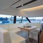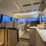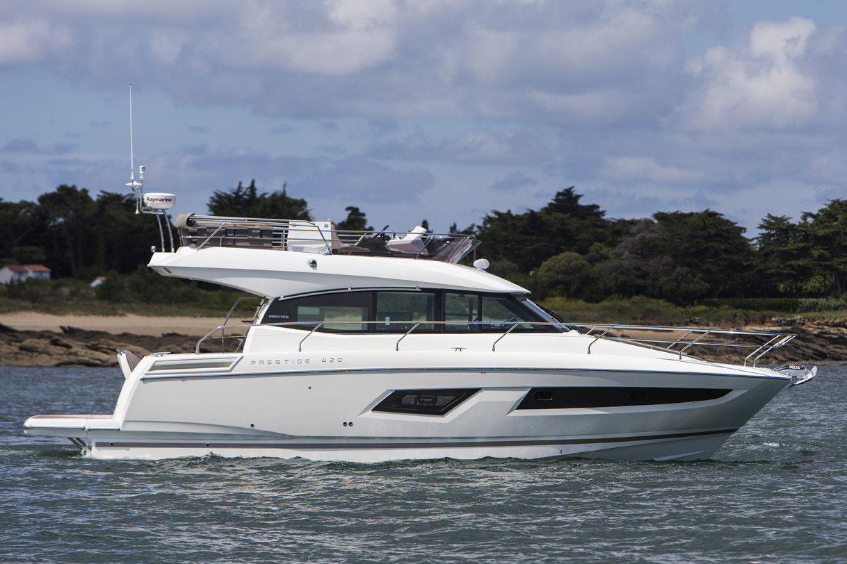 Egal, ob Sie an der Brücke sitzen oder im Innenraum stehen: Durch die Fenster der Prestige 420Fly haben Sie einen Rundumblick aufs Meer. Selbst ein knapp zwei-Meter-Mann braucht sich nicht zu bücken, um aufrecht stehen zu können.